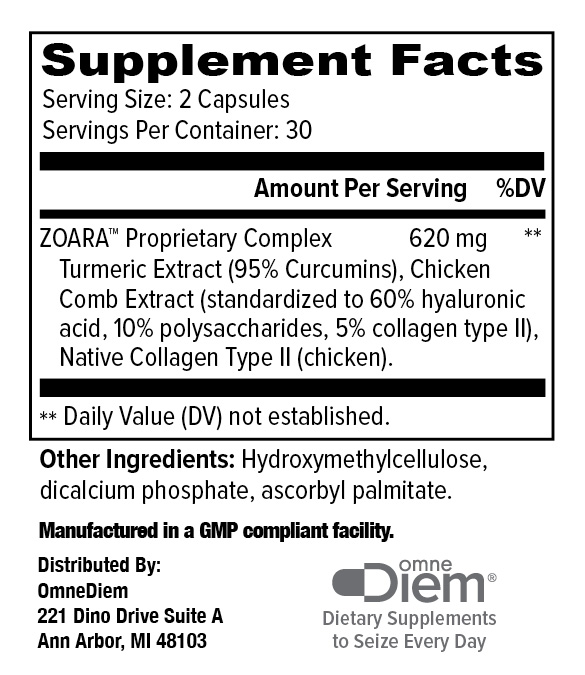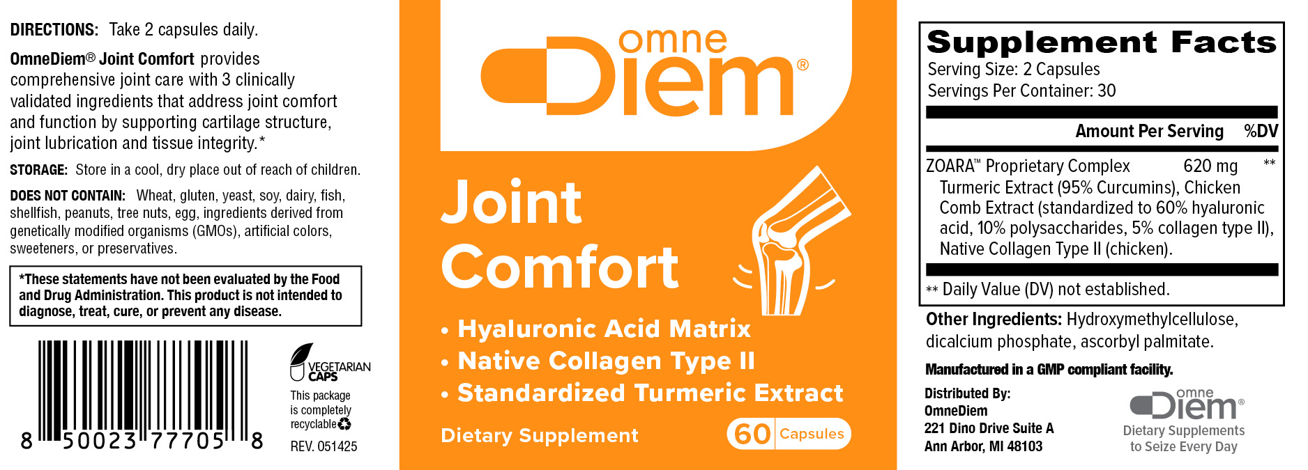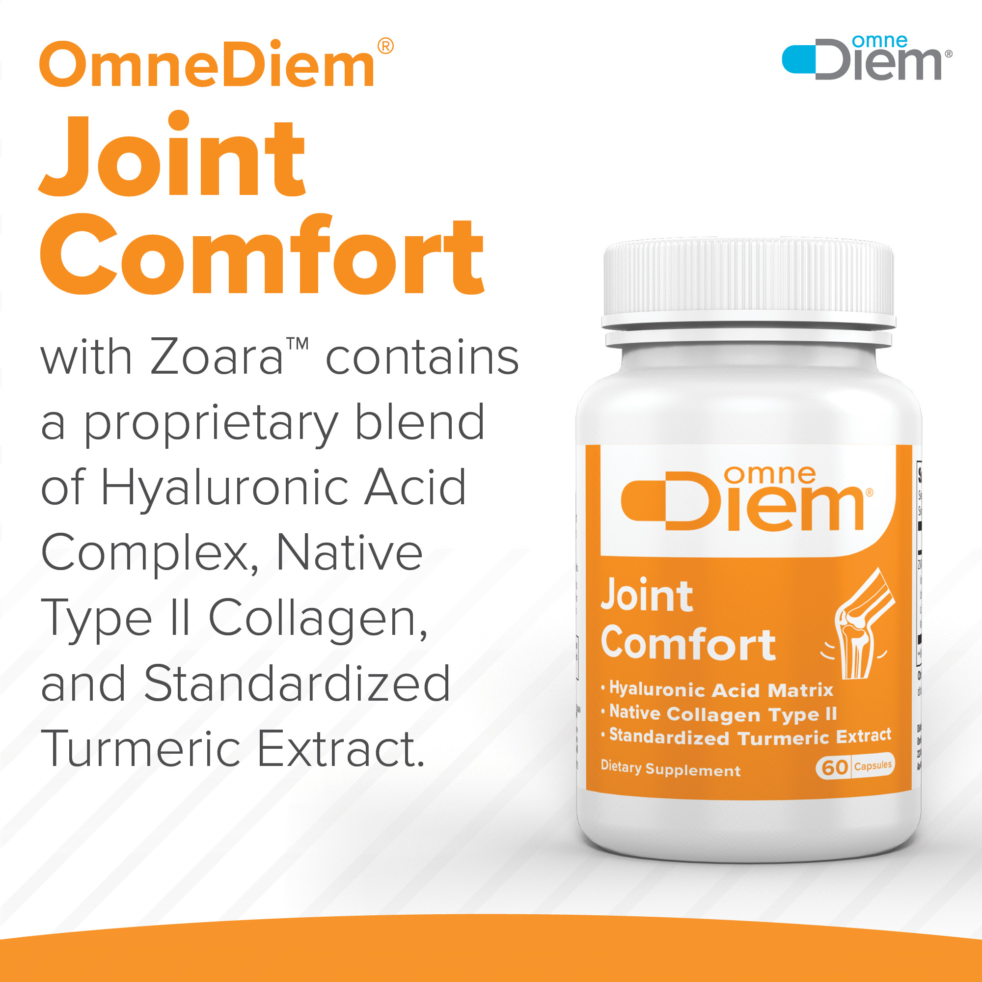 OmneDiem Joint Comfort provides comprehensive joint care with ZOARA™, a proprietary complex of 3 clinically validated ingredients that address joint comfort and function by supporting cartilage structure, joint lubrication and tissue integrity.*