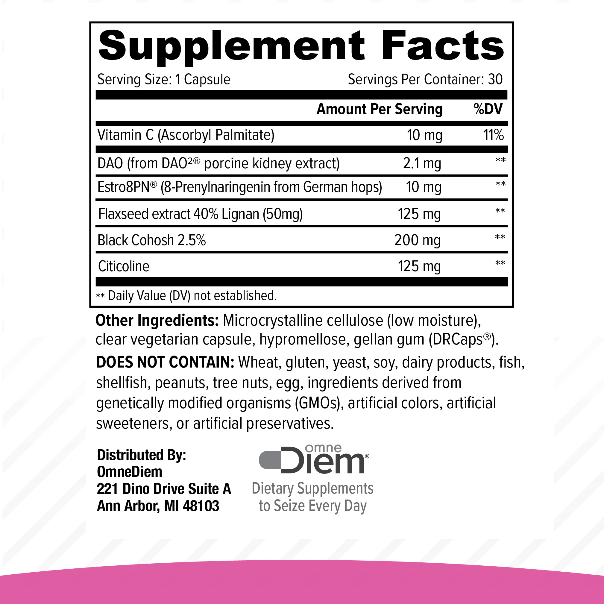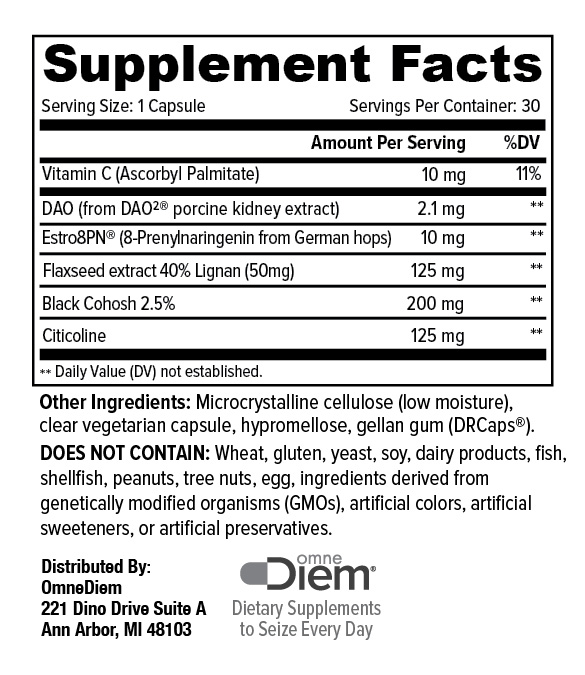 OmneDiem® Menopause Complete supports the body’s healthy response to the natural changes occurring during menopause. The addition of DAO supports natural histamine levels and processing which are impacted by hormonal fluctuations.*