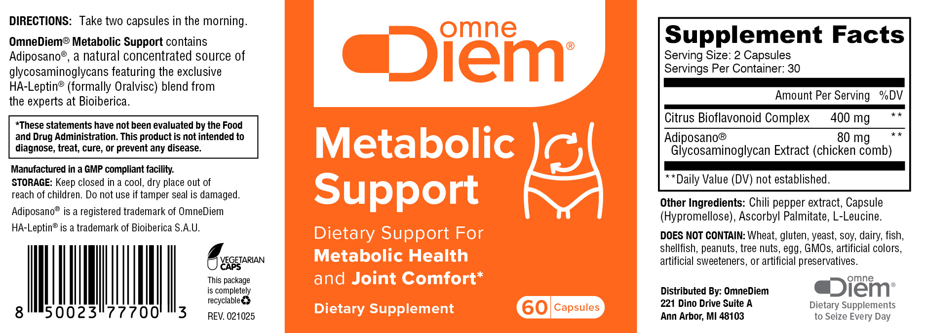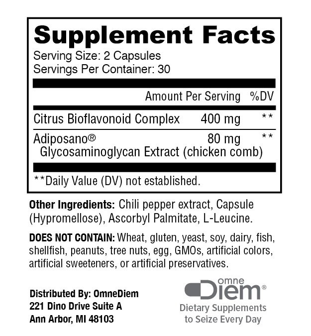 OmneDiem Metabolic Support, naturally supports metabolic health, joint comfort and weight management by promoting the reduction of white adipose tissue and modulating adipokine release.* OmneDiem® Metabolic Support with Adiposano® contains a patented, unique Glycosaminoglycan (GAG) complex rich in Hyaluronic Acid (HA). Very safe Certified Metabolic Health Metabolism refers to every chemical process in the body necessary for maintenance of life. Metabolic health optimizes these functions to ensure the body works properly. Experts suggest that only 12% of US adults are metabolically healthy† Contributing Factors & Complications Age Metabolic processes do not operate as well as one ages—nearly 40% of the US population is 45 or older. Overweight & obese More than 65% of US adults are considered overweight or obese. Prediabetes Estimated 88 million US adults have prediabetes. As many as 84% don’t know they have it. The Intersection of Joint and Metabolic Health Excess adipose tissue is not just passive fat storage but also impacts whole-body metabolism by synthesizing and secreting several hormones and pro-inflammatory compounds that can directly impact joint comfort and function. Metabolic effects of excess White Adipose Tissue (WAT) Joint health effects of White Adipose Tissue (WAT) How OmneDiem® Metabolic Support With Adiposano® Works The concentrated Adiposano® complex works naturally to support metabolic health, joint comfort and weight management by supporting the reduction of white adipose tissue and modifying adipokine release.* Connection Between Metabolic Health & Joint Comfort Metabolic concerns may impact blood pressure, abdominal obesity, glucose and lipid levels Increase in inflammatory compounds such as adipokines, (including leptin), leads to insulin resistance Abnormal joint tissue metabolism Imbalanced cartilage and bone homeostasis DOES NOT CONTAIN: Wheat, gluten, yeast, soy, dairy products, fish, shellfish, peanuts, tree nuts, egg, ingredients derived from genetically modified organisms (GMOs), artificial colors, artificial sweeteners, or artificial preservatives.
